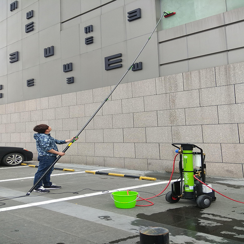 學(xué)校內(nèi),多為低樓層建筑,高度普遍在20米以下。此高度的建筑外墻、玻璃外墻、連廊的清潔,處于較為尷尬的境地。搭建腳手架登高進(jìn)行清潔,員工的人身安全得不到保障,危險(xiǎn)系數(shù)明顯上升,員工的工作積極性低。外包專業(yè)的高空清潔作業(yè)團(tuán)隊(duì),每年兩次清潔,投入費(fèi)用過高。意大利IPC高空清潔機(jī),能夠解決20米以下低高空外墻清潔的難題,設(shè)備自帶的四級(jí)過濾系統(tǒng),將水中的總?cè)芙夤腆w含量低,充分提高水的潔凈力,配合伸縮桿或快裝桿,其清潔高度可達(dá)20米,且清洗過后的作業(yè)表面自然風(fēng)干沒有水漬。無需登高作業(yè),既充分保障了安全性,又能完成清潔作業(yè)任務(wù)。